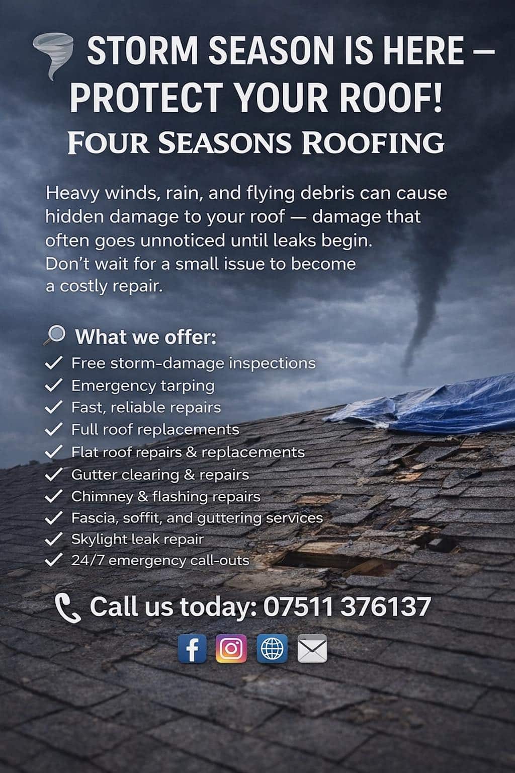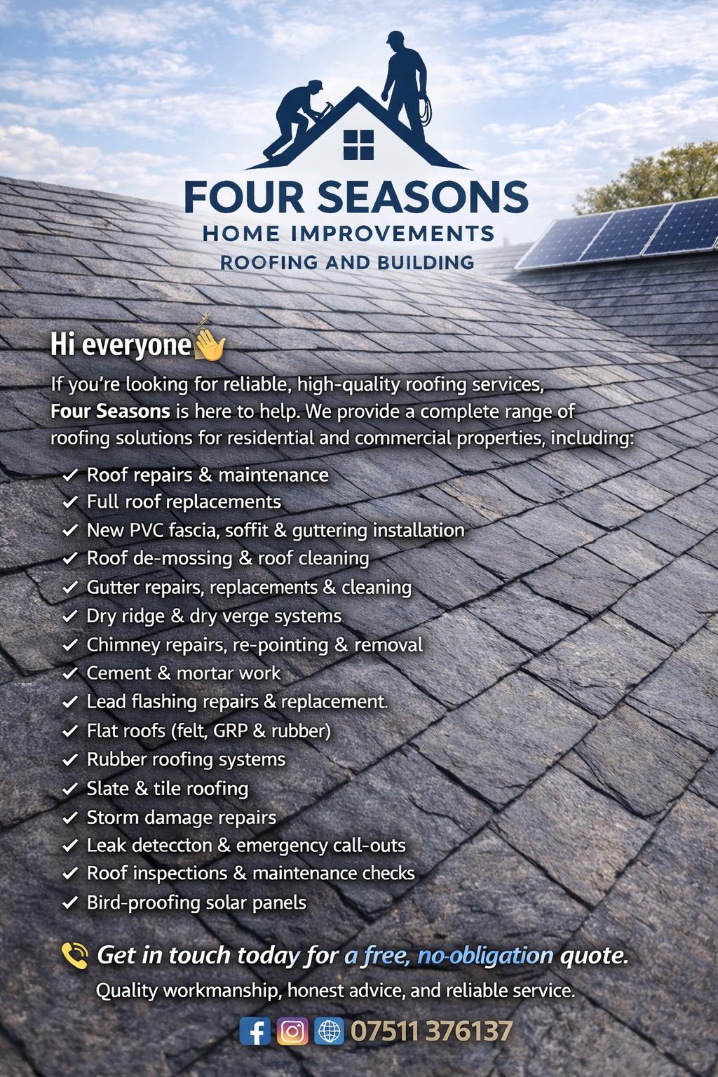 Roof Windows & Skylights + Lead Work + Roof Inspections & Surveys + Storm Damage Repairs + Moss Removal & Roof Cleaning + Insulation Installation + Roof Replacements + Commercial Roofing Solutions + Pitched Roofs + GRP Fibreglass Flat Roofing + EPDM Rubber Roofing + Standing Seam Metal Roofing + Ridge Tile Replacement & Repairs + Liquid Rubber Roofs + Roof Coating & Sealing + More